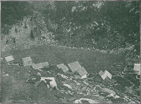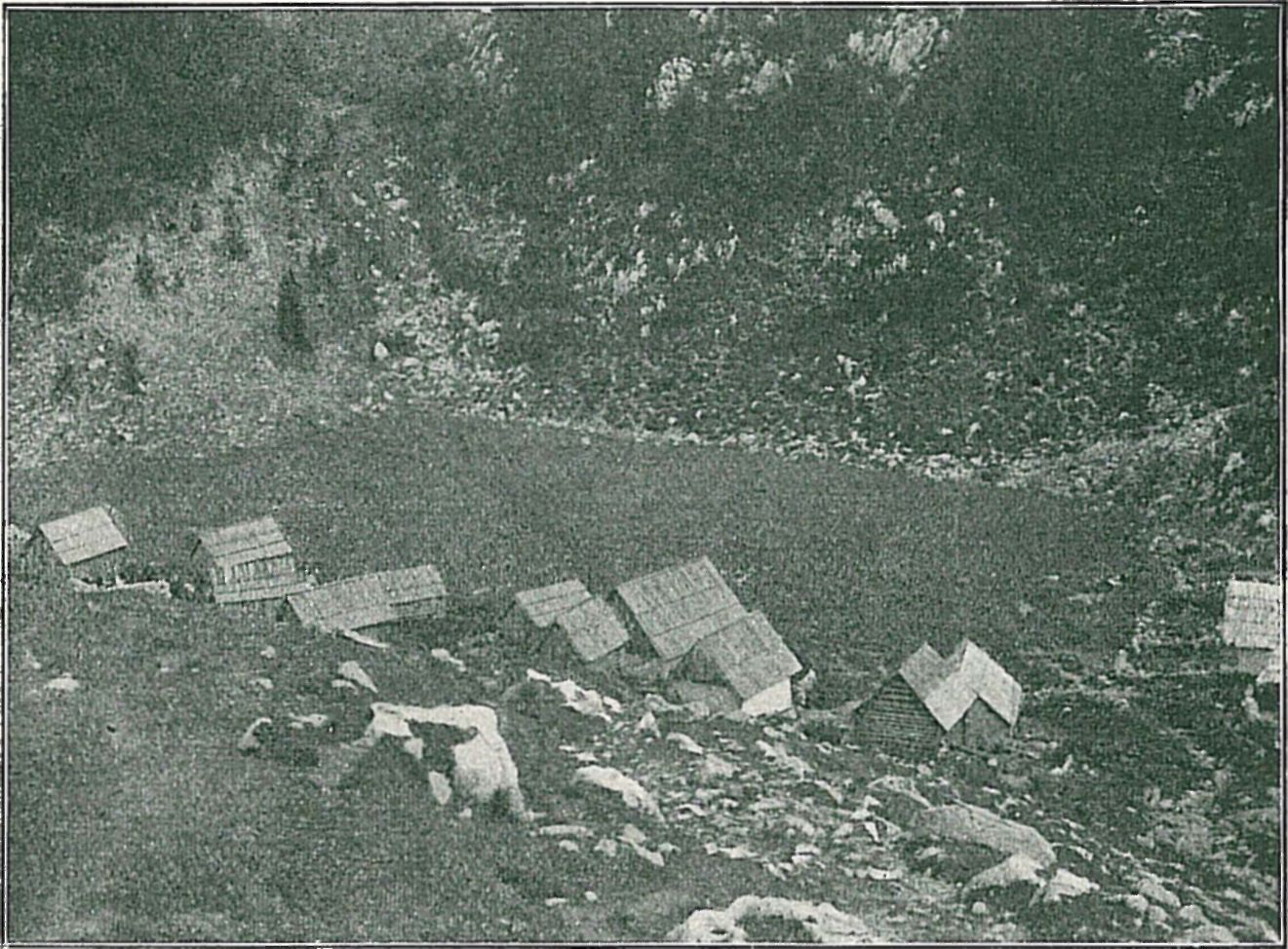 v zkrasovělé obrubě (viz obraz salaše na Dednem polji), ve větších koutech ledovcových bývá to rozložení přímočaré na jedné straně koutu, nad měkkým a začasté vlhkým dnem (viz obraz Ravničke planiny). Je-li dno koutu prostorné, suché, jsou přístřešky stavěny rovněž v přímočarou řadu, někdy má skupina ráz ulice, tu na př. salaš Govnjač pod Bogatinem. Jindy jsou jednotlivé koliby rozsety bez jakékoli pravidelnosti na př. u salaše „pri Jezeru". V půdoryse skupiny nelze tedy zjistiti ethnických zvláštností, seskupení řídí se dle místních tvarů povrchových. Tak je tomu také u salaší pásma dinarského.