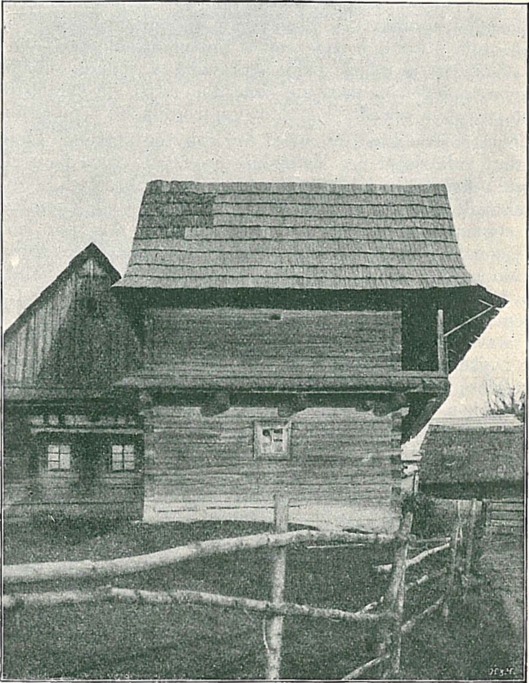 komora, jež je vlastně rozšířená síň dělená podélně. Tím vzniká dům trojdílný. Teprve potom, jak za to mám, přenáší se ohniště a ústí peci do zadní části síně, bývalé komory, vzniká kuchyně s komínem a celkový vývoj je skončen. — Avšak další rozvoj hospodářský žádá zvláště pro obilí pokud bylo na hromadách vhodnější místnosti, než byla dosti přeplněna komora. Toto se dává do podstřeší nad komoru, kde někdy pro uvolnění konstruují střechu při stavbě výše — nemyslím, že by se