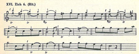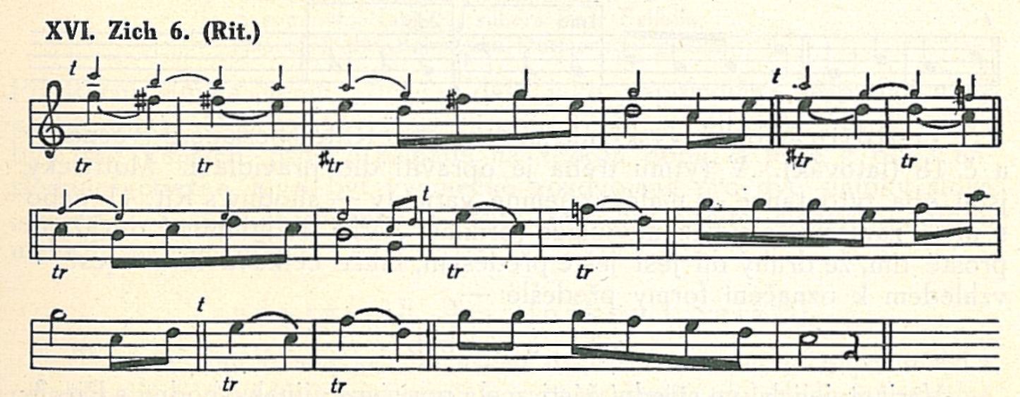 Sem patří tanec Rit. 41, nadepsaný „Tanz rückwärts" (naše „zpáteční"). Dle názvu soudíc, pocházel by tento zápis z německého kraje Cech, o čemž by svědčilo i to, že mezi německými písněmi Rittersberkovy sbírky vyskytuje se zcela týž tanec s textem německým (č. 15).32) Uvedu tedy raději příkladem svůj zápis z Chodska („zelený kousek"), jenž jest jeho variant jen v tom, že transponuje první díl do dominanty, tedy do G-dur proti základnímu C-dur: