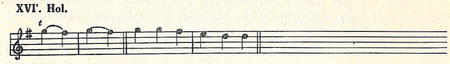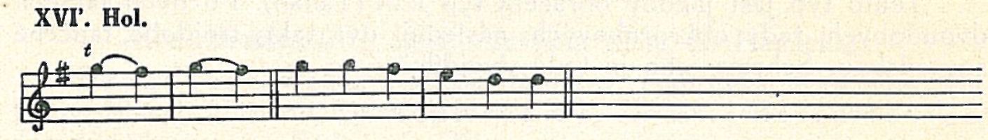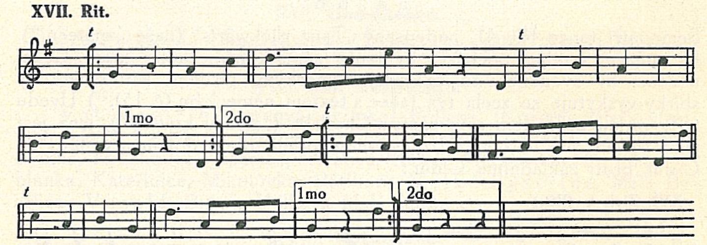 Trojdílná forma vyskytuje se dvakrát u Rittersberka:č.3 (vosňáky) a č. 18 (latovák). V rytmu třeba je opraviti dle pravidla I. Motivicky jsou oba tyto tance — malé vzájemné varianty — shodný s Rit. 41 nebo s mým zápisem, ale bez modulace (příklad XVI.). Trojdílnosti dosaženo prostě tím, že druhý díl jest ještě předeslán, takže celková forma jest — vzhledem к označení formy předešlé —