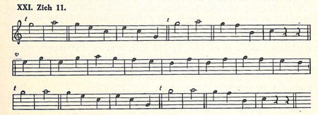 b) Této skupině je melodicky příbuzná jiná, z níž však jen jediný tanec, který jsem zapsal na Královéměstecku, patří mezi tance pravidelné. Ostatní probereme ve směscích (skupina „Všeháj"). Můj zápis (kozel) má formu trojdílnou, souměrnou; vložka jeho je dokonce totožná s vložkou skupiny předešlé.