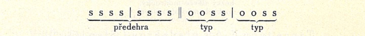 Mezi tanci „pravidelnými" — a podobně i mezi „směsky" — uvedu jen ty „tance s předehrou" nebo „s dohrou", jež buď určitě nebo aspoň velmi pravděpodobně tempa nemění. Ostatní proberu až po směscích, neboť je patrno, že jsou to útvary kombinované, spojující, krátce řečeno, princip proměny v malém s principem proměny ve velkém.