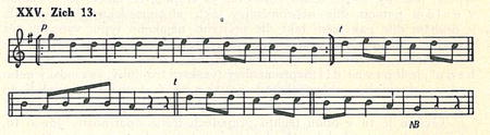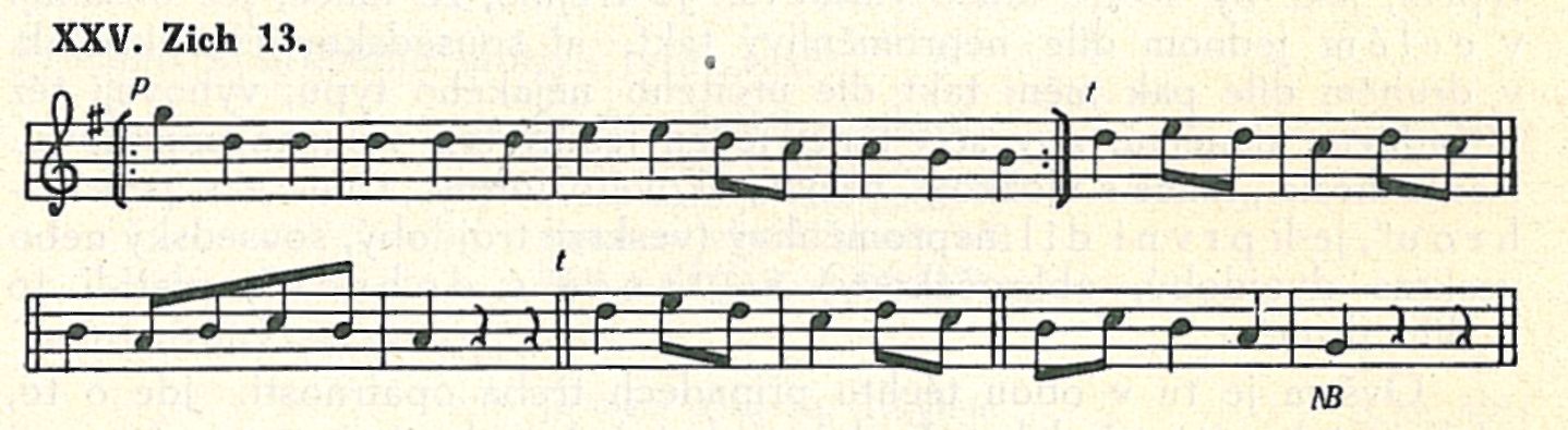 Ukázkou uvedu svůj zápis. Tanec z Č. L., rytmicky správný, je s ním téměř shodný, oba tance Hol., malé jejich varianty, nutno opraviti dle pravidla i. U tance Hol. V. 191 jsou nad to naznačeny jakési repetice, dvojdobých taktů; dostaly se tam patrně omylem.