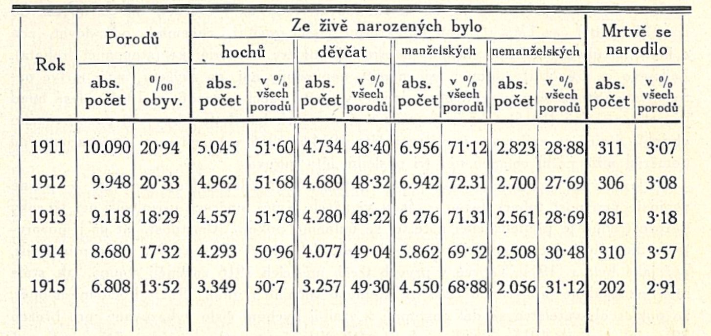 Tab. I. Porody v Praze a v jejích hlavních předměstích v pětiletí 1911—1915.
