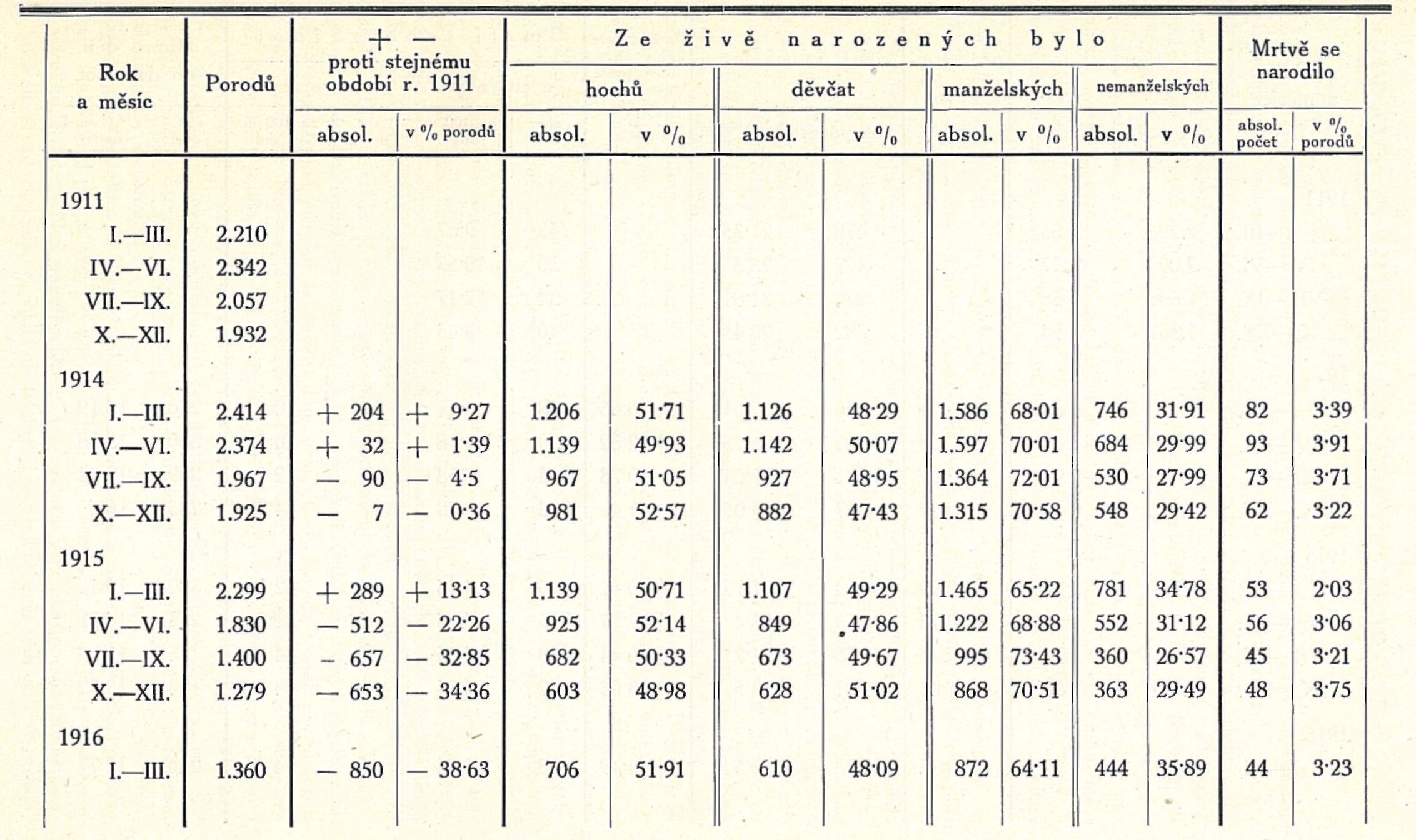 Tab. IV. Porody v Praze a v hlavních předměstích v pětiletí 1911—1915, pozorované v obdobích čtvrtletních.