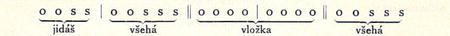 a) Nejprve uvedu tance jednodílné. Patří sem můj zápis z Zehuň-ska („latovák"). Po dvanácti taktech obkročákových zakončuje tanec dvěma takty sousedské. Schema tedy jest: