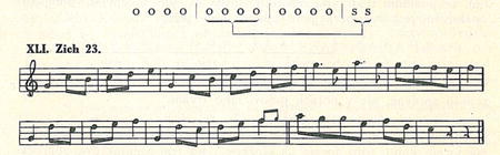 Motivicky je v typech s předešlými shodný; vložka jeho je dobře nám známá „Mozartovská" vložka ze skupiny tanců „Salát", totožná s vložkou př. XIX'., takže celý tanec činí dojem rytmického variantu příkladu XX. (srv. rytmická schémata obou).