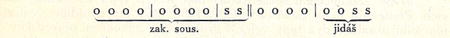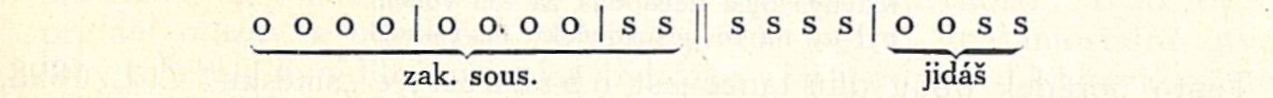 c) Zvláštní skupinu tvoří dva tance, Chr. 467 dole („hulán") a C L. 1899, 432 upr. („směsek"), melodicky malé varianty, v prvním dílu vůbec shodné. Tento první díl má typ „zakončení sousedskou" a obsahuje po osmi taktech dvojdobých (směsek z C. L. třeba opraviti dle pravidla I, tanec „hulán" je veskrze v osminách) dva takty třídobé. V druhém dílu vyhlíží tanec z Chrudimská též tak, jakoby končil sousedskou. Ale z důvodů architektonických nutno přičleniti z jeho šesti dvojdobých taktů dva poslední к následujícím dvěma ťaktům sousedské takže s nimi tvoří typ „Jidáše". Mohli bychom tuto formu zváti též „zakončení Jidášem". Schema tance tedy jest: