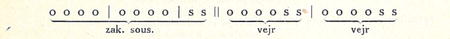 Podobné uspořádání má „směsek" Hol. V. 149. První díl je „zakončení sousedskou", obsahuje však motiv, od předešlého zcela odlišný. Setkáme se s ním opětně v oddílu 10, neboť tvoří taktéž první díl několika tanců (viz příklad L.). Za to druhý díl — dva typy vejra — užívá opětně motivu „karafiát" (př. XXXIII., díl druhý). Rytmické schéma jest (zápis opravíme dle prav. I.):