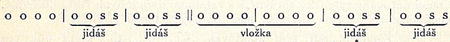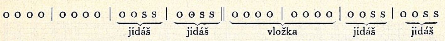 b) Zcela jiným motivkem začíná několik dalších tanců. Melodicky se shoduje s vložkou tance př. XXII,, nabývá však tečkovaným rytmem úvodním energičnosti. V ostatním materiálu motivickém se tyto tance s předešlými shodují. „Směsek" Chr. 494 nah. má rytmické schéma totéž jako předešlý matenik Hoř. 41 a v druhém dílu je shodný s Č. L. 94, 432. Jednodílný „klatovák" Chr. 470 nah. jest melodický variant první části směsku Chr. 494, takže jeho schéma netřeba vypisovati.