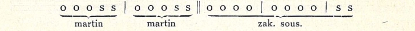 Dvoudobé takty „Martina" notují všecky ostatní zápisy nejen v notách polovičního trvání (čtvrťové místo půlových), ale se čtvrťovou pausou po třetí notě. Bylo by možno se domnívati, že tato třetí nota patří již do taktu trojdobého (podle notace zápisů ovšem do taktu tříosmino-vého, tedy s osminovou pausou) tak jako tomu skutečně bylo při typu „sýkorky" a „měkoty". Leč tomu odporuje jednak zápis můj, jednak to, že taneční popis uvádí na tyto tři noty tři kroky obkročákové, tedy i na notu poslední obkročák a nikoli sousedskou. Pausy takové vůbec není a lze si ji v zápisech vysvětliti jen snahou, vpraviti motivek do dvoučtvrtního taktu. Tanec C. L. 99, 432 zapsán jest jinak rytmicky správně, ale v notách polovičních. Oba druhé zápisy třeba opraviti ještě dle pravidla I.