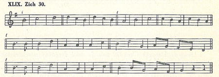 Hol. V. 273 je s mým „zápisem v prvním dílu zcela shodný, v druhém malý variant. Zápis z C. L. 1894, 438 je melodicky zcela konfusní. Správně zapsán je pouze první typ „Martina". Druhý typ má mu úplně odpovídati, jen o tón níže, jak jest u všech ostatních zápisů. Má tedy zníti: d'ef, f e d, f e d. Druhý díl tance, jak ihned patrno, zapsán byl v F-dur, ačkoliv první díl je v C-dur; třeba jej tedy položití o kvartu níže. Pak se jeví tanec jako variant tance Holasova.