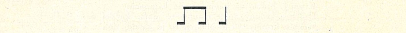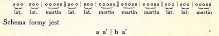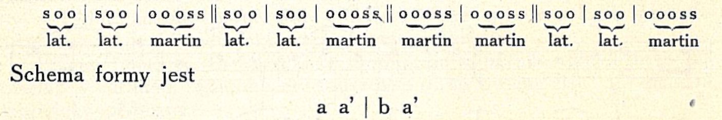 Týž rytmus mají dvoudobé takty „Martina" v dalším mém tanci, „latováku" z Zehuňska, jenž však vedle toho obsahuje zcela nový typ „Latováka". Byl jsem nucen nazvati tento typ tak všeobecným názvem, poněvadž jsem jej našel jen v tomto jediném tanci, který je bez textu a byl mi právě jen jako „latovák" hrán. Mohli bychom typ ten zváti též „obrácená višeň", ježto v něm proti typu „višně" (o o s) sled taktů jest opačný. Po jediném taktu trojdobém (sousedském) následují dva takty dvojdobé (obkročákové). Typ je tedy třítaktový a dvojdílný:
