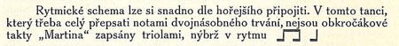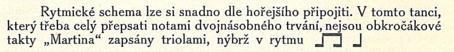 takže bychom je mohli též považovati za nepřesný rytmus tuto označený. Na tom však nezáleží. Okolnost, že byly hrány nepřesně, svědčí již o tom, že nebyly tyto takty cítěny v rytmu furiantském. Ostatně později (v oddílu 13.) setkáme se s tanci, obsahujícími taktéž trioly, tentokrát zcela přesně rytmicky hranými — jen že tam po nich nenásledují dva takty sousedské, takže nevzniká typ „Martina".S(3)