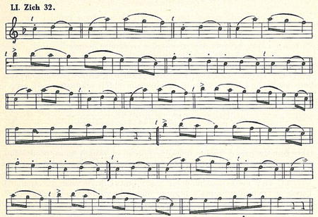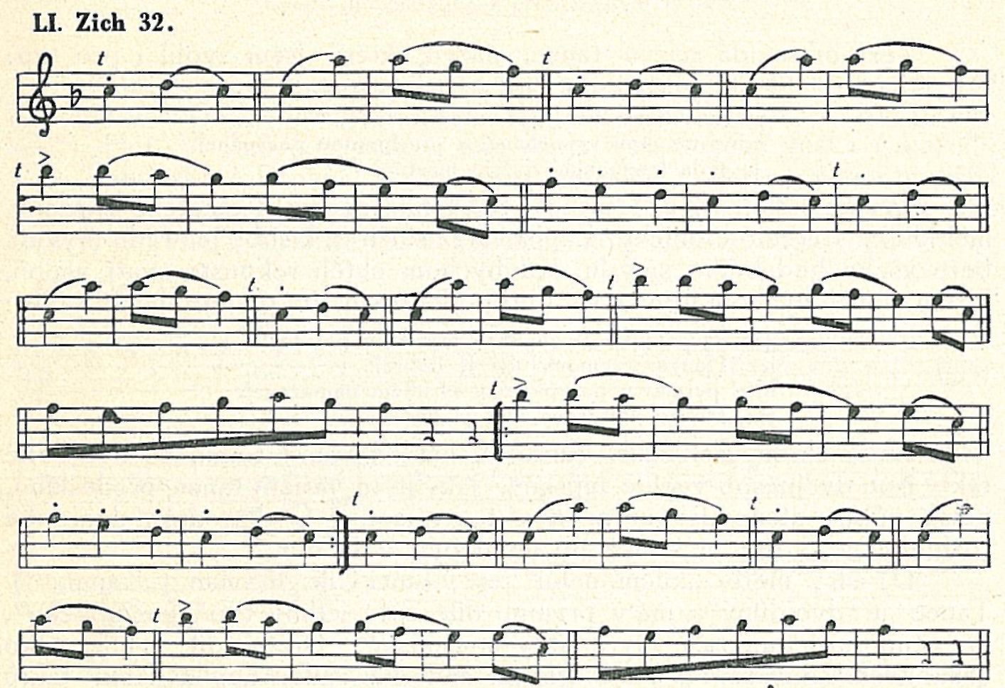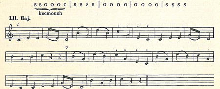 Vyskytuje se ve dvou motivech. První jest v tanci „kucmouch" C. L. 1897, 544/5 a v jeho nezměněném otisku Č. L. 1903, 366. Tanec jest dvojdílný a třeba jej opraviti dle prav. i. V prvním dílu jest nejprve jeden typ „kucmouchu"; motiv jeho trojdobých taktů jest týž jako u vložky směsků Hol. V. 167 a 168, o nichž promluveno bylo v oddílu 2. Po něm následují čtyři takty sousedské, motivicky s předešlým příbuzné. V druhém dílu je nejprve osm taktů obkročákových, vytvořených z motivu obkročákových taktů „kucmouchu", po nich čtyři takty sousedské, rovné obdobným taktům dílu prvního. Rytmické schéma obsahuje tedy jen jediný typ „kucmouchu" a jest: