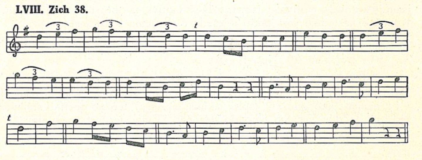 a) První skupina týká se známého tance „O v e s" a jeho variantů.59) „Oves" EN. 592. jest dvojdílný, třídobého tempa volného, po způsobu menuetu. Jeho malý variant jest „Oves" Chr. 485. dole (druhý notový příklad.) Podle Zemánkova popisu tančí se celý valčíkem, což je možno jen tak, že se rozštěpuje každý jeho tříčtvrtní takt na dva (tříosminové) takty valčíku. Je to rozhodně „moderní" způsob tance pro „Oves" a „rytmus celé melodie se tomu vzpírá. Větší variant jest můj zápis z Zehuňska („Oves") tím, že se v posledním taktu druhého dílu vrací к motivu úvodnímu: