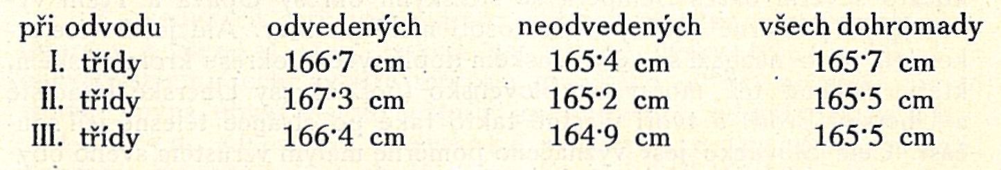 Dalo by se očekávali, že srovnání tělesné výšky mladíků při odvodech I., II. a III. třídy stanovené poskytne jakéhosi obrazu o vzrůstu mladíka v dotyčných leteh (20—22 let), ale výsledek nepodává žádného objasnění, neboť vypočetl jsem pro pražskou a josefovskou oblast průměrnou výšku mladíků