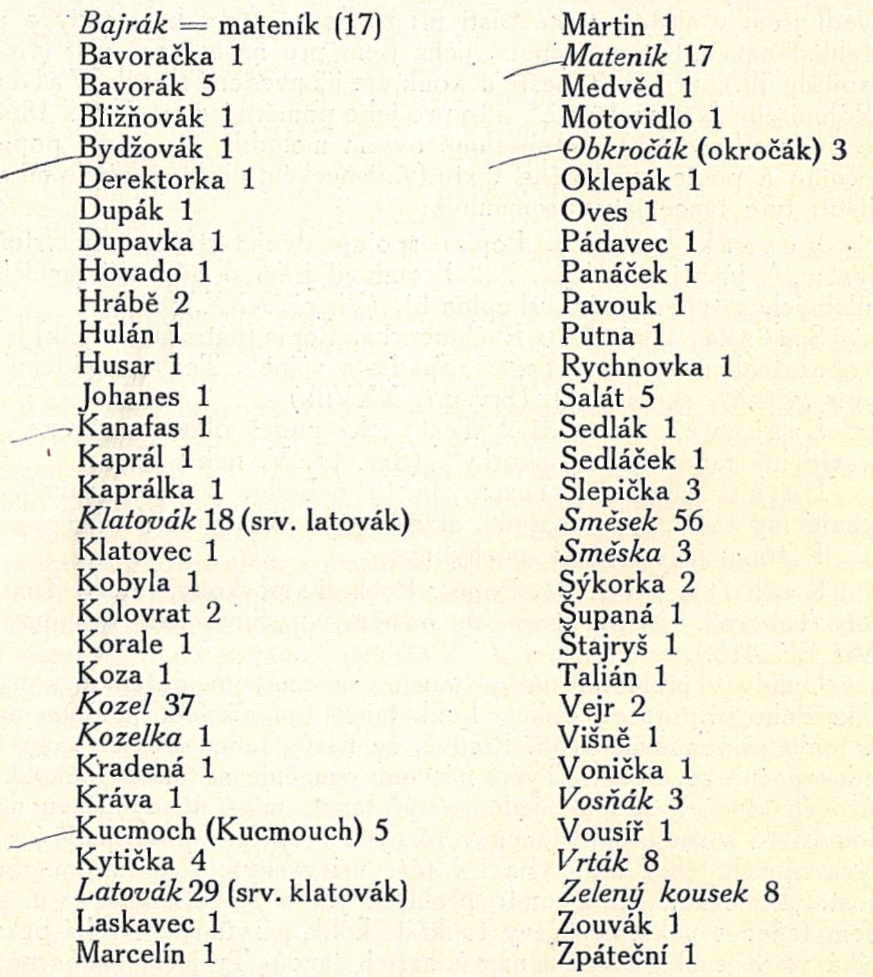 jmenuje lid těmito obecnými názvy, takže číslice ta by mohla býti větší. Podle sdělení Zemánkova jmenuje na př. lid na Nechanicku proměnlivé tance obecným slovem „kozelka". Ale „kozelka" vyškytá se v mém materiálu jen jednou: je to tanec, který mi Zemánek zaslal jako rukopis s poznámkou, že pochází z Nechanic, a jehož nepatrný variant otiskl pak pod názvem „Klatovák" v Chrudimsku-Nasavrcku str. 469 (z Javor-ného). Obecný název „bajrák" v mém materiálu vůbec se nevyskytuje v článku „Národní tance na Hořicku" píše však p. Hynek „mateníky nebo bajráky ..." (str. 416), z čehož patrno, že se názvu toho užívá tak jako názvu mateník. — Proto odliším tyto hromadné názvy od ostatních tiskem.