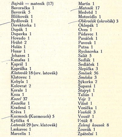 Všech názvů je 62, z nichž 12 je obecných. Obecné názvy „obkročák" a „vrták" jsou vlastně, jak v předešlé úvaze o způsobu tance vyloženo, názvy nepravé, ježto přísluší jiné skupině tanců, kde se kroky toho jména výhradně vyskytují. Z názvů, к nimž patří větší počet tanců, běží u těchto vždy o menší nebo větší varianty jediného tance: Bavorák, Hrábě, Kolovrat, Kytička, Salát, Sýkorka, Vejr. U „Kucmochu"
