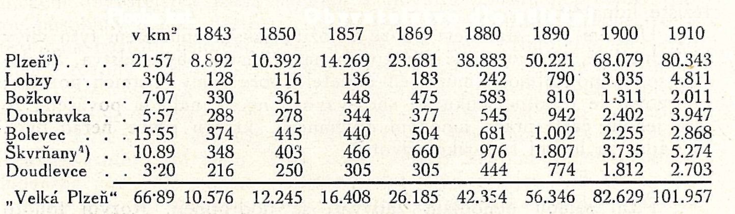 Největší vzrůst města Plzně spadá do období 1857—1869 a 1869—80. Jsou to léta, kdy železniční trati nahrazovaly spojení silniční, kdy Plzeň stávala se důležitým uzlem moderní komunikační sítě. Roku 1861 byla dopravě odevzdána trať Plzeň—Domažlice, r. 1862 zvláště významná trať Praha—Plzeň, r. 1870—71 byla otevřena trať Cheb—Plzeň—-Vídeň a r. 1873 trať Duchcov—Plzeň—Eisenstein. Okolní obce teprve později počínají jeviti silnější vzrůst. Nejdříve Skvrňany začaly těžiti z blízkosti města a továren; v desítiletí 1880—90 počet obyvatelstva v těchto obcích