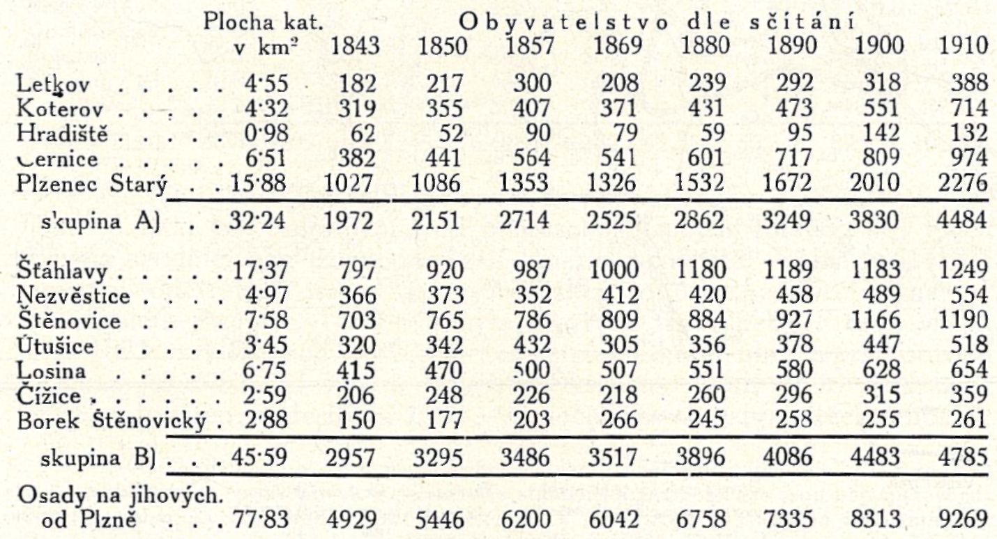 Chceme-li sledovati vliv Plzně na přírůstek obyvatelstva i v dalším okolí, narážíme na překážky velmi vážné v několika směrech. Přímý účinek velkého města mísí se tu namnoze s účinky oněch blízkých průmyslových oblastí, které sice patří к plzeňské oblasti v širším smyslu, přece však mají své zvláštní podmínky i vývoj dosti samostatný vzhledem к Plzni samé. Jen v jednom směru převládá vliv Plzně samé velmi silně, není-li zcela panujícím, a to směrem к jihovýchodu. Uvádím-li v přiložené tabulce i místa, která jen o polovinu zvýšila své obyvatelstvo od r. 1843, má to ten důvod, že v celém širokém okolí Plzně přírůstek takový u osad bez průmyslu jest řídkou výjimkou.