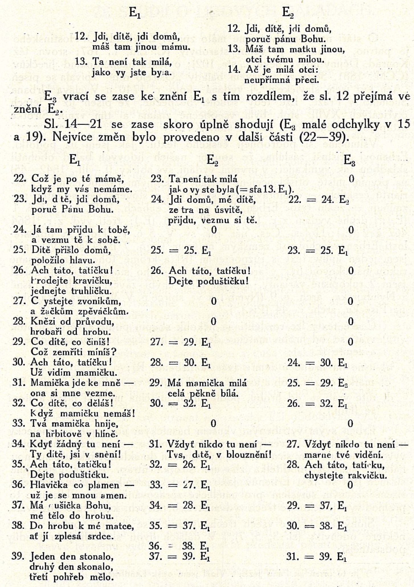 V E1 píseň má 39 strof, v E2 37, v E3 31; pro vydání konečné byl text zkrácen o 8 strof. V E2 jest změn poměrně málo: sl. 22—24 E1 byly zhuštěny ve dvě (23—24) a zbytečná sl. 33 Ex byla vynechána,