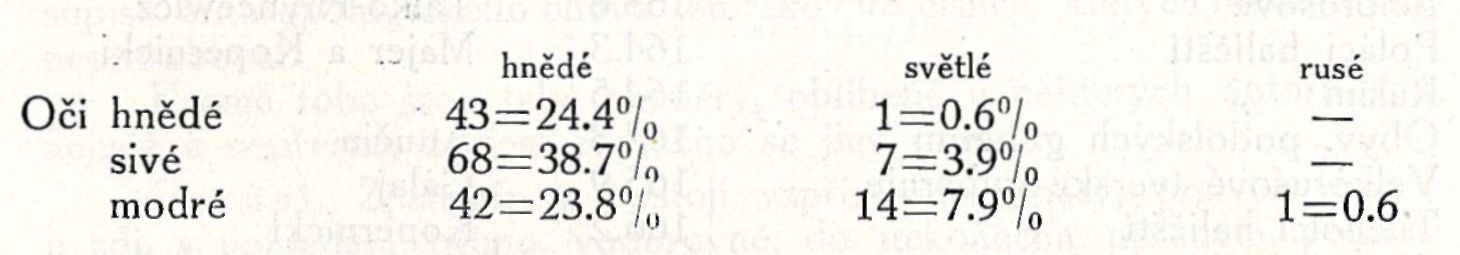 Pigmentace (barva očí, vlasu, vousu, pleti). Stupeň i variace lidské pigmentace patří к důležitým rozlišovacím znamením při somato-logickém studiu lidských skupin. Skupiny temné pleti, jako Černoši, ukazují sice na pohled jednotnost, ale při bližším zkoumání jeví dosti značné odstíny, které také z části jsou vyvolávány změnami po dobu indivi-duelního vývoje. Jinak jest tomu ale u skupin evropského obyvatelstva. Zde nejeví se jen odstíny u jedné skupiny, ale často protichůdné rozdíly — jako světlé oči a světlý vlas proti temným očím a tmavému vlasu, které právem dávají tušiti, že se tu jedná o několik složek dědičných, jež tímto způsobem své tvrvání prohlašují, tedy abychom tak řekli, jsou to znaky faenotypické. Proto těmto rozdílům věnována všude náležitá pozornost; tak stalo se i zde. Barva očí určována dle Martinovy stupnice a označujeme v následujících přehledech číslo 1—6 jako hnědé, 7—12 jako sivé, 13—16 jako modré oči. Ku porovnávání barvy vlasu a vousu sloužila stupnice Fischerova; zde značí čísla 4—8 hnědé, č. 9—26 světlé vlasy. A tu jsme našli tyto poměry a korrelace: barva očí a vlasu