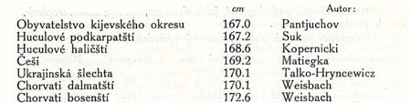 Vidíme tu, že Huculové jsou meziskupinami slovanskými s vzrůstem prostředním, a že je předčí pouze Ceši a Jihoslované; vedle toho pak ještě ukrajinská šlechta, jež ovšem nám představuje již skupinu zvláštní, kde padají na váhu vlivy od okolního obyvatelstva se naprosto lišící. Mimo to musíme podotknouti, že ze všech skupin horalů karpatských, obývajících jižní i severní svahy horské, mají Huculové vzrůst nejvyšší, neboť Bojkové, Lemkové a Tucholci karpatští jsou postavy o hodně nižší; máme tedy zdě několik skupin horalů, žijících vedle sebe, v stejném prostředí, jak klimaticky tak i hospodářsky a společensky, různících se však dosti patrně svým vzrůstem. Proto můžeme se domnívati, že značný rozdíl u Huculů jest asi podmíněn nějakou složkou jinou, přimíšením elementů vysokorostlých, které ostatním skupinám — Bojků, Lemků — schází.