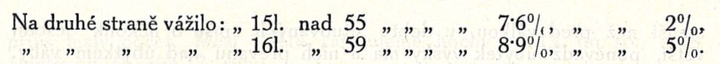 Zajímavo je, že střední odchylka od průměrné váhy je po válce poněkud menší než dříve, a to u 151etých 5'3, u 161etých 6, proti 5'7 a 6'3 před válkou. Shledáváme tu tedy jakési naznačení nivelisace, o níž mluví Pfaundler, ovšem jen ve zcela nepatrné míře; což jest ostatně přirozeno v naší skupině, kde jedná se o hochy téže společenské vrstvy a přibližně také podobných majetkových poměrů, ačkoliv i tu mohou být jisté rozdíly v zámožnosti.