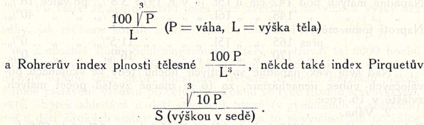 V době poválečné zvláště v Německu zabývali se mnoho zkoušením, možno-li těchto indexů použiti к objektivnímu stanovení stavu výživy tělesné. Tato snah@S@a byla vyvolána zvláště potřebou zjistit rychle a objektivně školní děti trpící podvýživou a vhodné к doporučení americké pomocné akci. Ukázalo se však, že žádný z těchto indexů se pro určení výživy tělesné dobře nehodí; Pfaundler1) uvádí mezi jinými důvody, že je tu přílišné uplatňování výšky těla nad vahou, takže malý index mají často děti spíše velké než hubené.