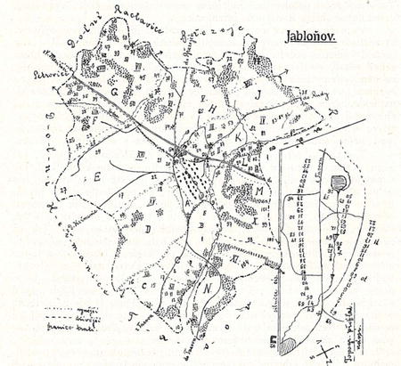 Spisy nejnovějšího našeho katastru pozemkového jsou v tom ohledu chudé, neboť jméno pozemku stalo se zatím zbytečným. Obsahují proto namnoze jen jména tratí a to ještě hrozně zkomolená, což zaviněno různými opisovači, kteří, chtějíce vykonati v krátké době mnoho práce, jména jim nesrozumitelná neb špatně čitelná libovolně si domýšleli, ba i úmyslně poněmčovali. —