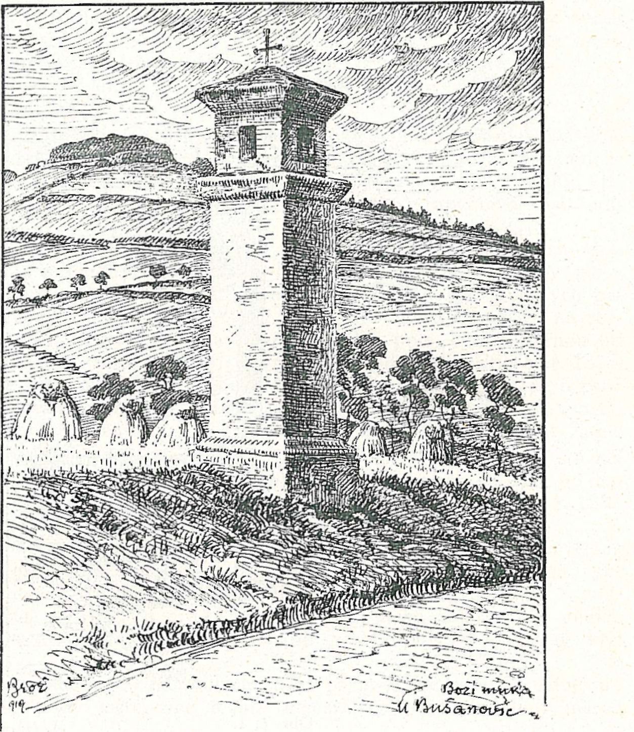 Jistou vytříbeností slohovou vyznačují se třetí boží muka (obr. č. 3.), zdvihající se na výšině při cestě ze Zelibořic к Předslavicům, tam kde tato stezka dotkne se nejblíže lesa Bisanovce. Jest to táž stará stezka,