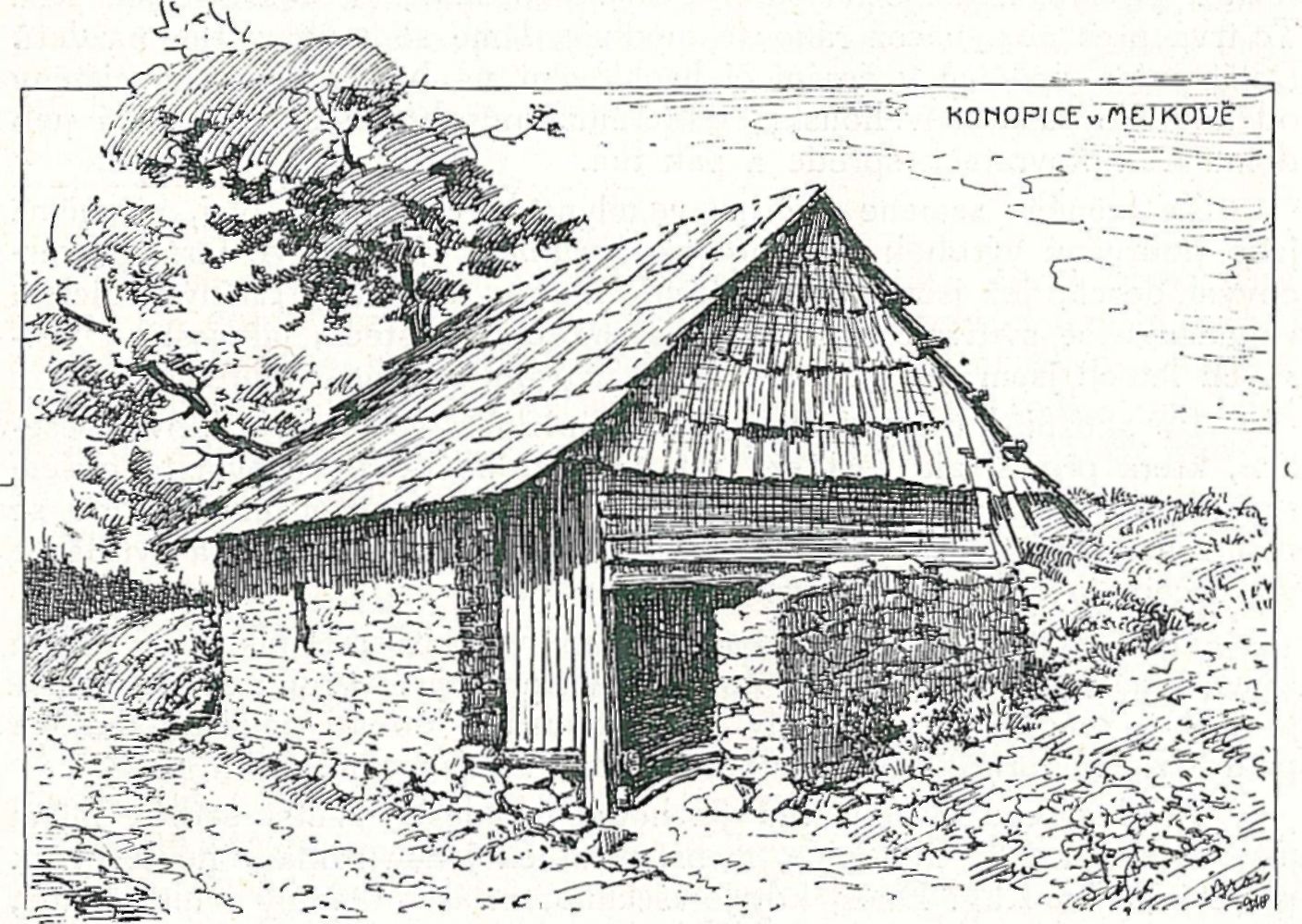 motná sušárna a v ní pec. Dým z pece naplňuje místnost sušárny, pronikne při sušení otýpky lnu nakladené na stropě a ztrácí se střechou. Strop utvořen jest ze tří až čtyř trámů, přes něž kladeny jsou tyčky, zhruba osekané to smrčky či ostrve.