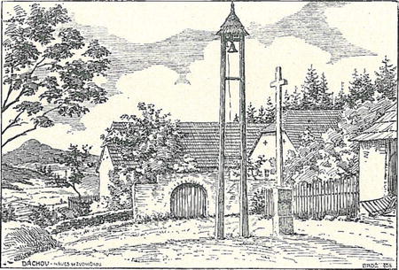 dali špatnou krytinu a kaplička po nějakém čase se sesula. Vzali pak za vděk touto, jakou na obrázku spatřujeme. V pozadí přiloženého obrázku vidíme bývalý panský dvůr, kde stávalo vladycké sídlo Dáchov-ských z Dáchova. V 15. století patřilo toto zbožíčko vladykám Sedleckým z Oujezda, z nichž Bohuslav Sedlecký své jmění, tvrz a ves Dáchov s Kosmem roku 1695 prodal Ferdinandu, knížeti z Dietrichsteina, jenž je připojil к panství vlachobřezskému. Zadní budova, nyní stodola, jež daleko s výše své shlíží do kotliny Lažištsko-Záblatské, posud má ve štítu letopočet 1668. Les za dvorcem sluje „Hradec".