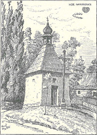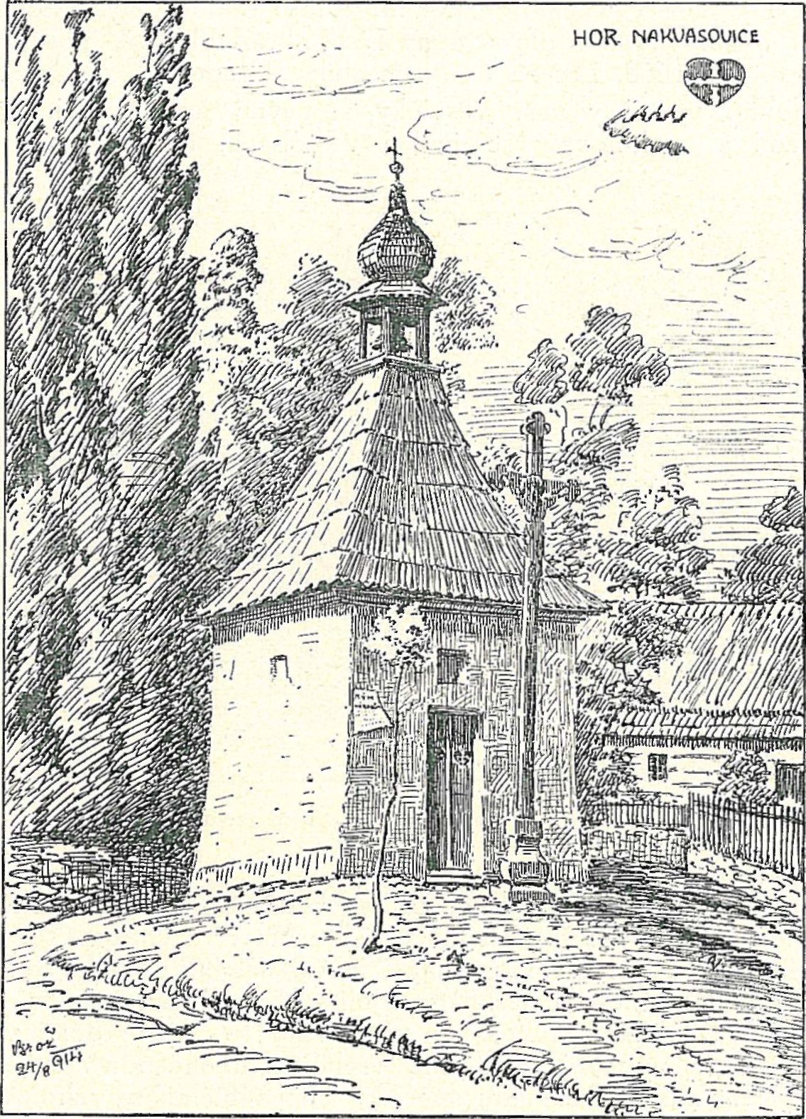 obraz jindy příležitostně uvedu, vyniká jako pěkná ukázka venkovského baroka se štítem zvonovitého obrysu, římsou a sloupky děleným. Ornamentální výzdoba, jakož i zbožná legenda a datum výstavby jsou charakteristické znaky domácího mistra zednického, Jakuba Bursy, po němž celé širé okolí uchovalo si řadu rázovitých staveb selských gruntů. Mistr prozrazuje