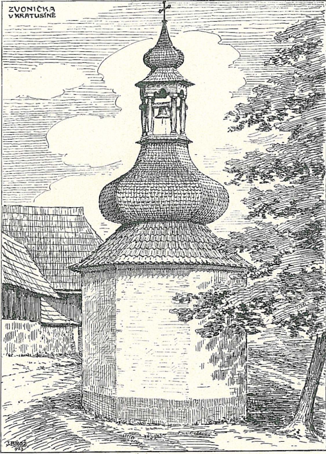 jihočeský mistr tesařský svou dovedností a postavil spoluobčanům vzor, jakých v okolí není. Celá střecha, červeně natřená, pokryta jest drobným šindelem, jehož každý kousek zvlášť vyřezáván, aby tvořil krajkovité linie jednotlivých Šárů. Ze nesloužil к její stavbě jednotný,