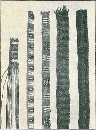 Obr. 4. Paličkované čipky z okolí Topolčan: a—c) ze Solčan, d) z Topolčan, e) z Hrušovan.