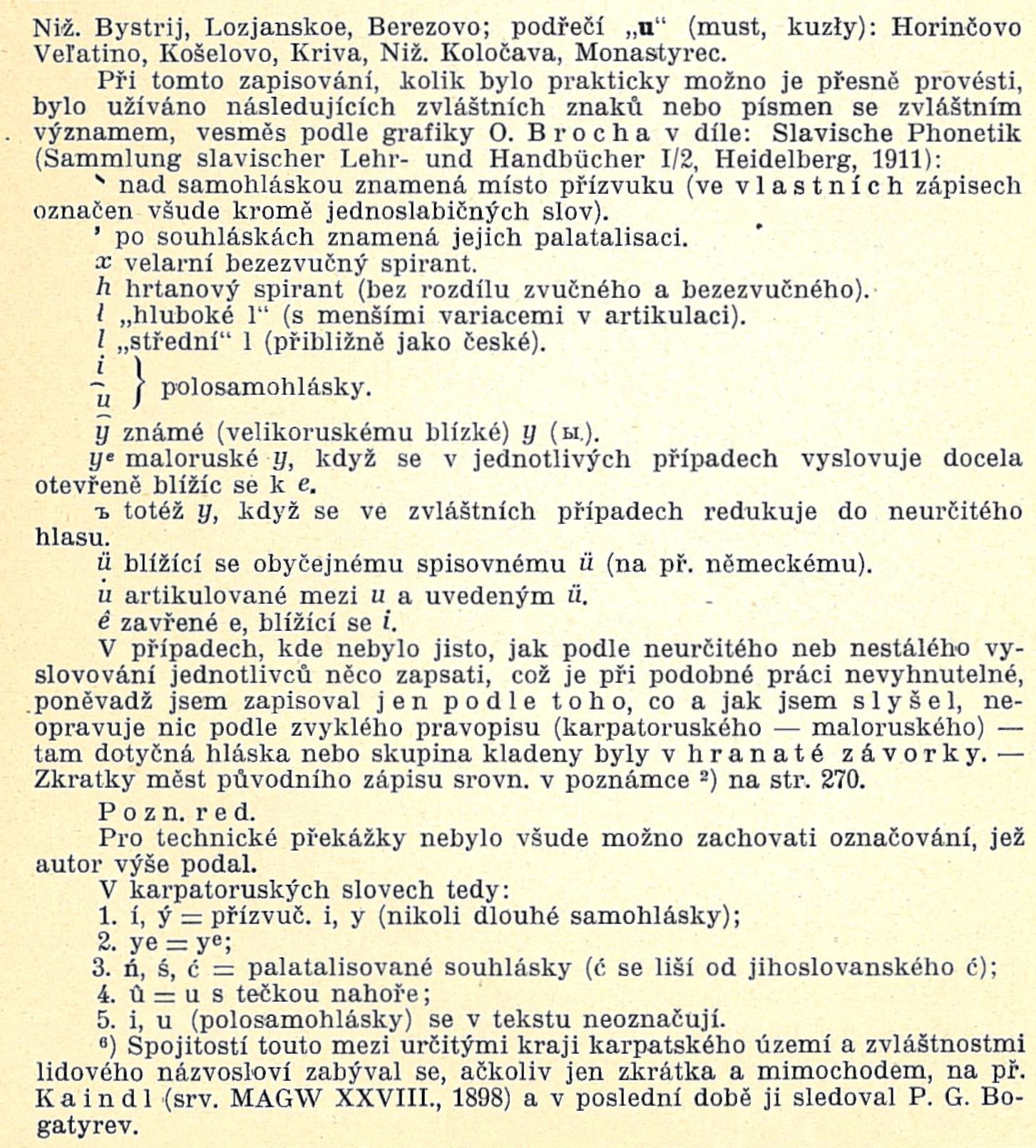 toto přesnější (Zapisování mělo za následek některé drobnější variace, jež mají svůj původ, v opravdu různém vyslovování lidu i ve stejné vesnici za různých okolností a u různých osob. Částečně budou tyto zvláštnosti mluvy pro etnografické badání bez významu, ač dosavadní zkušenosti v tomto- ohledu ukazují, že v některých případech, zvláště zde na. karpatském území, ani ty nejsou zcela bez důležitosti i pro úkoly národopisného studia. Dvojí měrou platí to především o různostech, objevujících se více méně pravidelně mezi různými názvy stejných předmětů, které rozlišují právě lidovou ..nomenklaturu toho nebo onoho kraje.0)