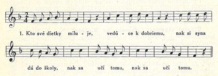 Rytmus je veľmi primitívny, podobne i melódia je monotonna; tak v prvej ako i v druhej polovici jedna veta stále sa opakuje. —