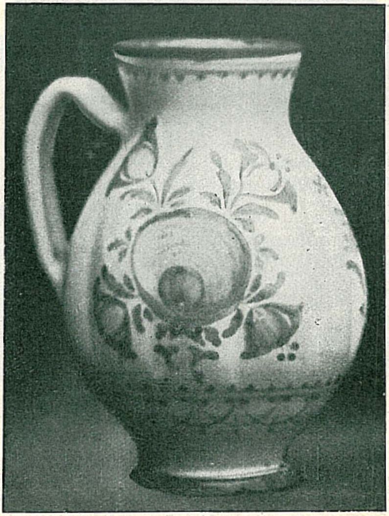 Ze zmíněných dvou terrin (obr. 4, mus. inv. č. 121 a 122; jest větší asi práce zakázková pro nezjištěného I. K., jehož monogram s vročením je pod oběma uchy, menší pak zboží tržní. Větší má poklici tvaru komolého kužele o průměru základny 30 cm a na hoření ploše modelována je hruška se dvěma listy. Menší o průměru 26 cm má víko vyduté s pouhým knoflíkem. Hruška s listy je modře pomalována a celá plocha terrin