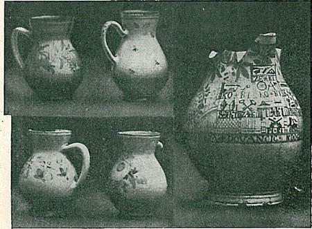 ažbánků v ivančickém museu, které jsou malovány v letech, jeho působení 1840—1860, hustou modří s nevelkou schopností výtvarnou, Chudá rostlinná komposice nedosahuje ani průměru, výrobků Hejtmánkových (obr. 8 a). ,Jsou však známy i dva typické džbány společného cechu ivančického z této doby, o nichž, bychom mohli předpokládati, že je snad při tehdejší vzájemné podpoře cechů dal sotva cech mimo město dělati. Jeden z nich,-vročen ý 1857, je v museu ivančickém (obr. 8 b), druhý, vro-čený 1850,, je v Zemském museu v Brně.12) Nepochybuji o tom, že časem se objeví zápis v některé cechovní knize, který původce jejich prozradí.'