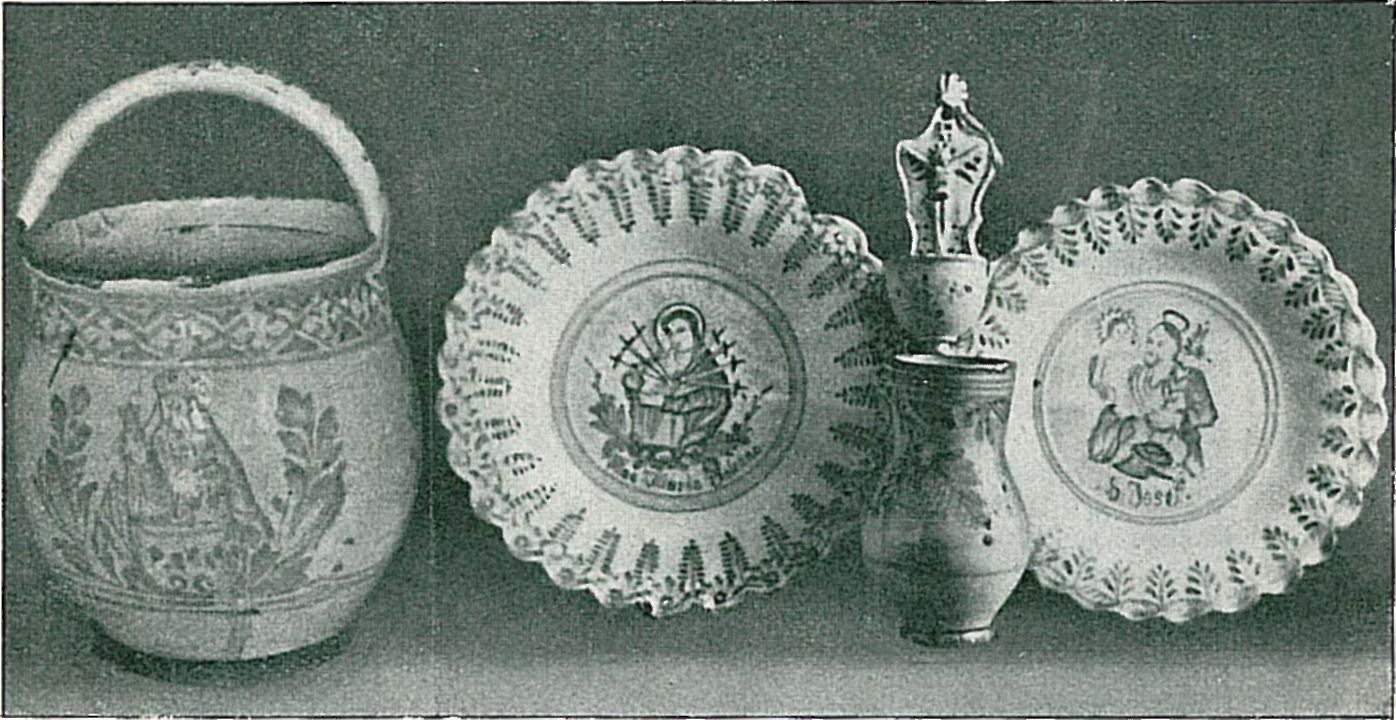 Pro jemnou malbu dělali si nejlepší štětečky z chloupků, které rostou hovězímu dobytku na uších. Barva modrá: šmolka a „königsblau" (královská modř na mísy) kupovaly se od „Stempechra" (Steinbrechra) v Brně, první libra (asi půl kg) za 40 kr, druhé lot (1'75 gr) za 1 zl. Ostatní se vyráběly doma, a sice fialovou dával „cinoš"15) (cín-olovo), černou „praun-štajn" (burel), žlutou zerzavé brusiny (usazenina při broušení