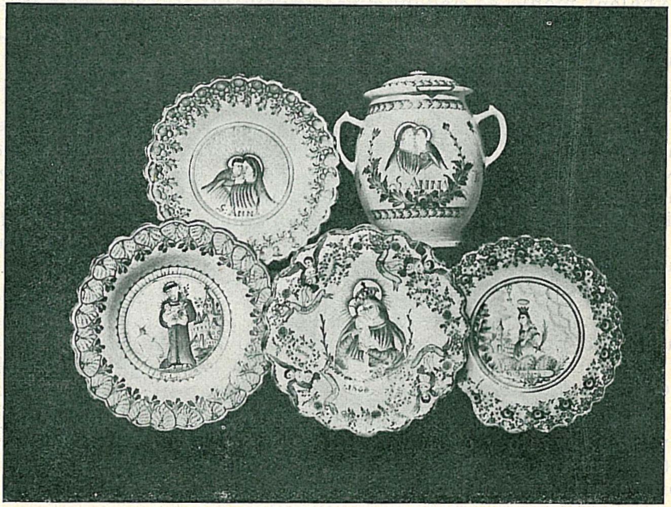 Obr. 12: 1. Mísa (č. inv. 23.500) o průměru 32 cm s vlnitě prohýbaným, zoubkovaným okrajem, modře malovaná. Na dně v kruhu je postava sv. Antonína, v pozadí architektura a dole nápis: S: Antonin Paduansky. Kolem kraje je ozdobný pruh z lístků se snítkami mezi listy. Na dně na druhé straně je nápis: Patří Antonij Buryan do Nro 13—1875 od Mary Za-wřzel.