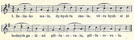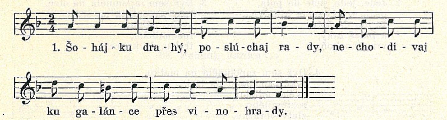 Poznámka: „Sedlcká" tančí se tak, že nejdřív šohaj píseň před muzikou zazpívá a hudba se snaží melodii zachytit, nato kývne na svou děvčinu a pleskne při tom dlaň o dlaň. Postaví se s děvčicí před muziku tak, že pravou rukou drží její levou ruku a kolébají se chvíli na miste vpřed a vzad, pohybujíce současně