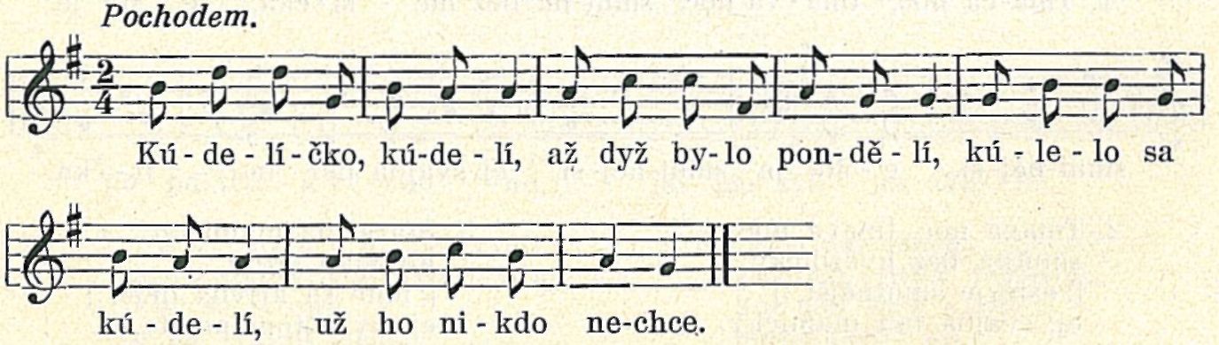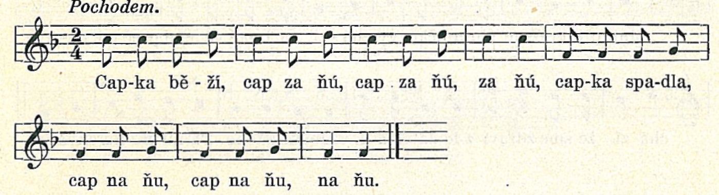 Tančí se tak, že děvče houpajíc rukama do zad ustupuje, kdežto šohaj dle taktu jako žába na rukou i nohou za ní po zemi poskakuje. Tónina písničky se neustále mění, vždy jeden verš o tón níže a druhý zase o tón výše atd.