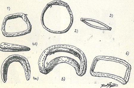1. Chamelka z Oščadnice u Kys. N. Mesta, 2. chomľa z Čadcy, 3. chomľa ze Starých Bystric, 4a) a 4 b) chomľa z D. Hričova u Pováž. Bystrice, 5. krkuľa ze Súľova, 6. chomuľa ze Stránského u Rajce.