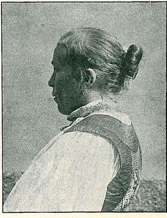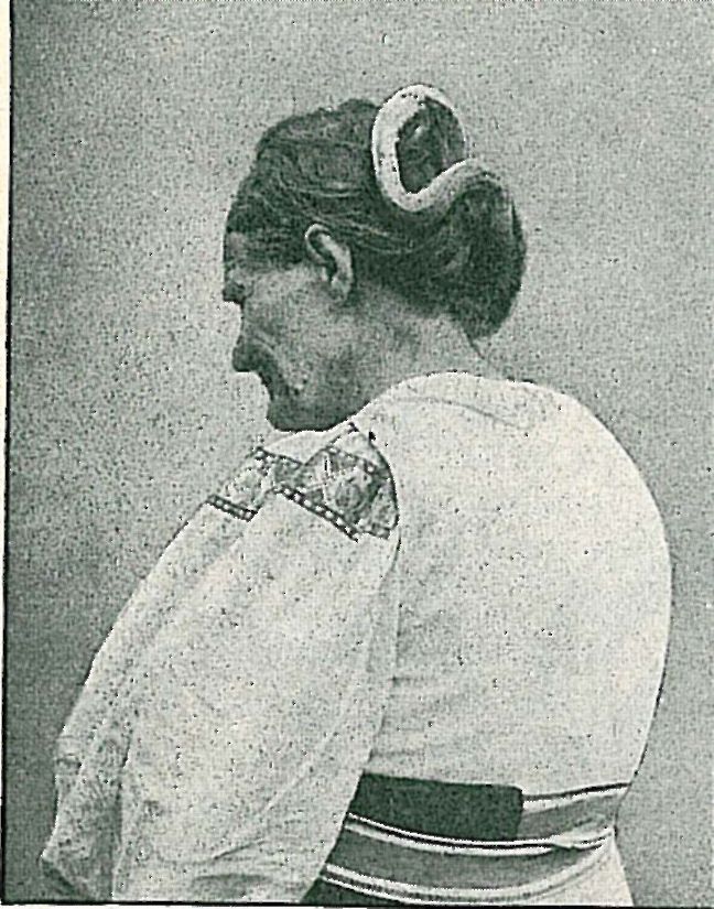 Na protějším břehu Váhu v úvodí Kysuce a Varinky nosily ženy „cholmu" poněkud odchylnou, rovnější, užší a drobnější (obr. 1.3.).Přikládaly si ji nikoli odzadu na temeno, nýbrž nahoru blíže k čelu, proto se musil oblouk na ní vyrovnati a je plošší než u chomle rajecké. Při tom však místy přece se objevuje snaha zvý-šiti formu hlavy. Na př. v Terchové stáčejí si ženy své vlasy podélně v týle a k temeni přikládají svinutý šáteček, takže dýnko čepce je vyplněno do kruhu a ční dost vysoko nad hladký, k hlavě přiléhající přední díl.