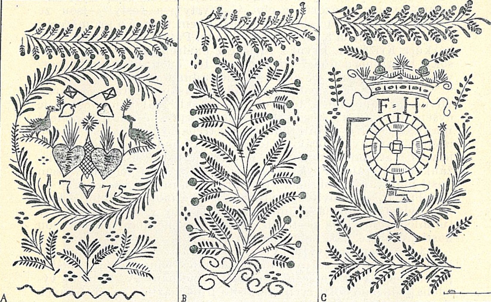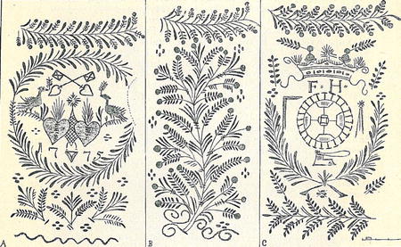 Výzdoba je figurální a rostlinná, barvami smaltovými: černou, bílou, tmavozelenou, červenou a žlutou, k nimž přistupuje později žlutozelená a modrá. Jak vidíme na obr. 4., připomíná mnoho soudobou výzdobu psaných modliteb. Na výrobcích pozdějších je ovšem malování bohatší, barvy jemnější a rozmanitější. Byly to zvláště velké láhve upomínkové ze 70. let min. století, které staly se někde „láhvemi svatebními", any stavěly se do prázdného středu svatebního' koláče a do hrdla místo zátky zasazovala se svatební kytka. Z Hlinecká zobrazuje takovou láhev K. V. Adámek;6) zvláště pěknou z Blatin na Novo-