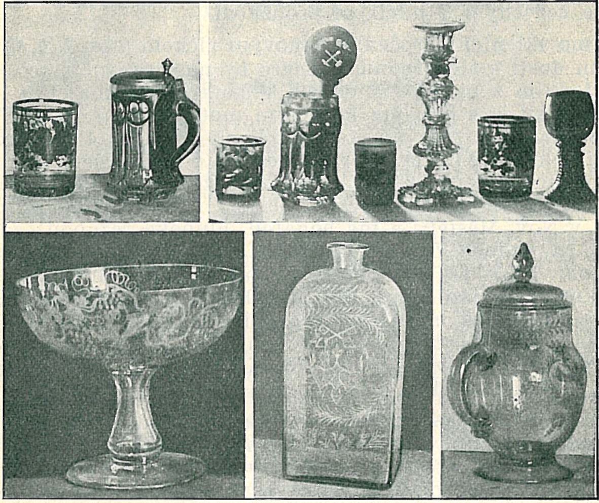 4. Nej dokonalejší a také i nejpůsobivější výzdobou je ovšem vzor rytý a řezaný, jak vidíme na obr. 7 č. 5—9. I takových bylo v horáckých domácnostech hojnost. Tak na př. na Křižánkách byly rodiny, kde měl každý člen skleničku se svým patronem, vskutku umělecky provedenou (na př. č. 5 s nápisem S. Francisco). Ale i znaky zaměstnání a pod. nebyly vzácností, a to jak v provedení podle pravidel tehdejšího umění (na př. č. 6 džbánek s cínovým víčkem s vyrytým MC 1743 a č. 9), tak i v pojetí „lidovém" (jako na př. č. 7).11)