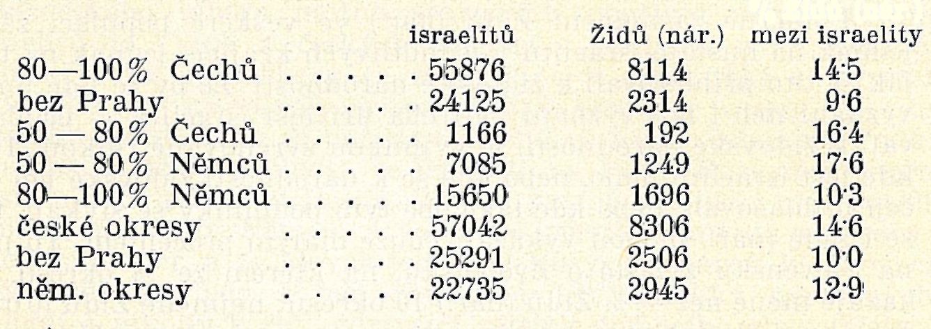 Nepřihlíží-li se ku Praze, shledáváme nejmenší — skoro stejné — procento Židů (nár.) mezi israelity v obou jednojazyčných Územích, % značně vyšší v obou územích smíšených, a to v německém o něco vyšší nežli v českém. Nesmí se ovšem při tom přehlédnouti, že české území smíšené je celkem malé,18) jak rozlohou a počtem obyvatelstva, tak zvláště co do počtu israelitů, kdežto německé území smíšené19) (rozložené hlavně v Krušno-hoří) je rozsáhlejší a především bohatší na israelity i Židy (nár.), takže padá.mnohem více na váhu.